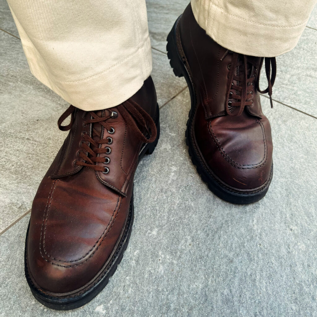 野生動物の傷跡をそのまま残したクドゥーレザー(Kudu)を採用。タンカーラストのボリューム感と、雨の日でも怯まず履ける堅牢さ。コードバンとはまた別の、最強の実用靴です。