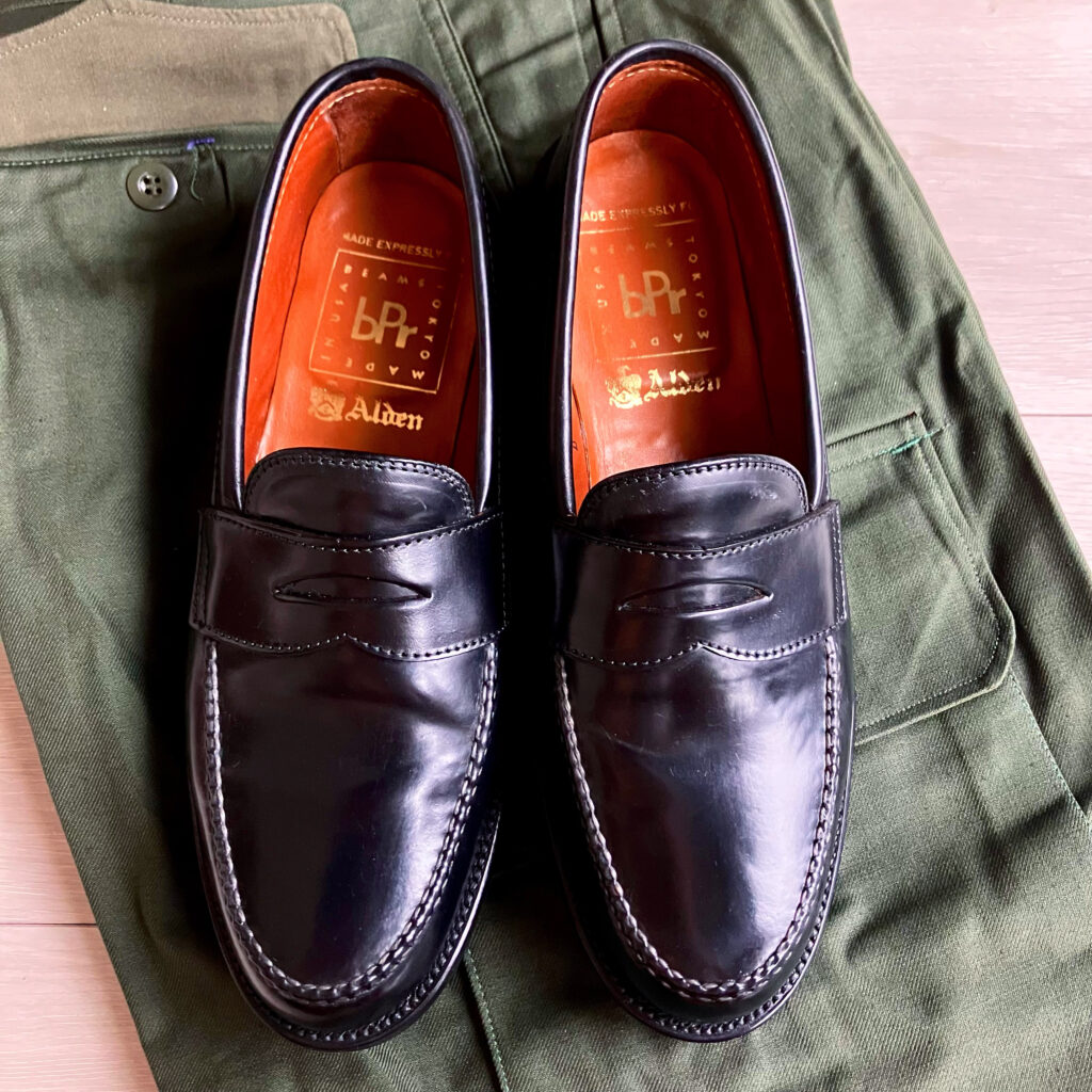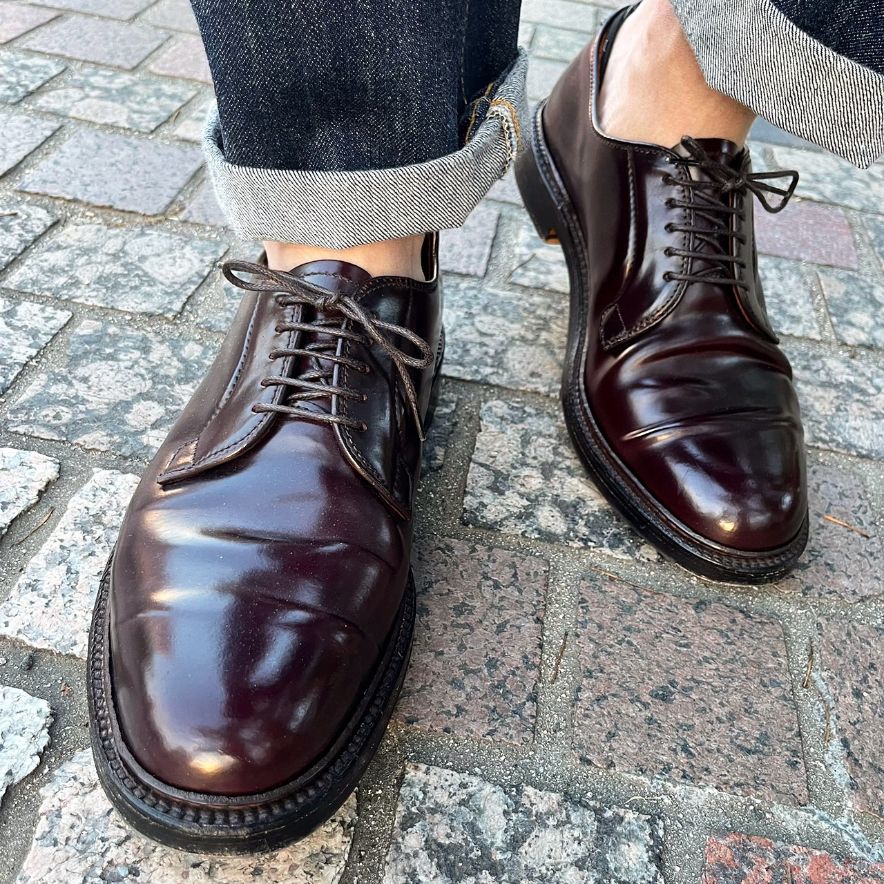 「キング・オブ・オールデン」。ブランドを象徴するNo.8カラーのコードバンと、ゆったりとしたバリーラストの組み合わせ。装飾を削ぎ落とした一枚革だからこそ、コードバンのうねるような皺が最もダイレクトに現れます。