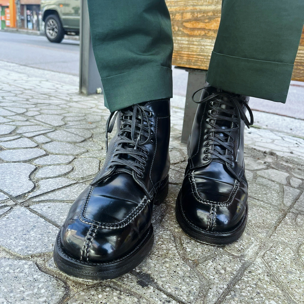 - ジーンズや軍パンとの親和性 無骨な太めのパンツに、ブラックコードバンの光沢を合わせる。ミリタリーラスト特有の「ぽってり」としながらも上品なシルエットは、軍パンとの相性は言うまでもなく、デニムさえも特別なものに変えてくれます。