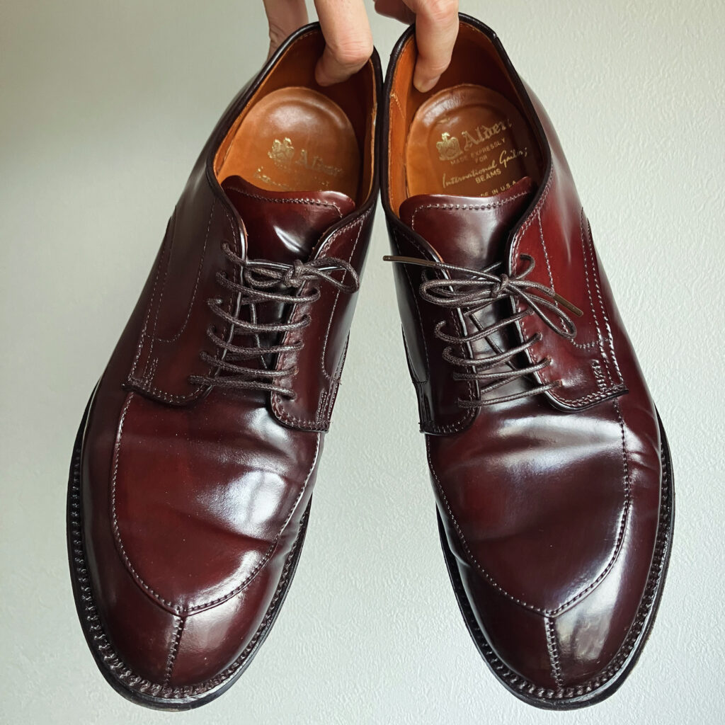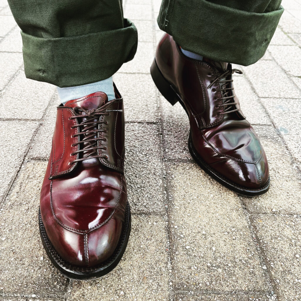 少し気分を上げたい日や、オフィスカジュアルで足元に個性を出したい時は、オールデンの990を選びます。 1884年創業、アメリカ・マサチューセッツ州の老舗。この「990」は、農耕馬の臀部から採れる希少なコードバンを贅沢に使用した、ブランドを代表する名作です。 コードバンならではの鈍い光沢、そして履き込むほどに刻まれる「波打つような太いシワ」は、牛革では絶対に出せません。バリーラストという少し無骨な木型と、バーガンディの色味。自分の足に合わせて育っていく感覚が最も強く、履くたびに活力をくれる一足です。
